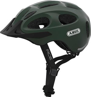 Abus Youn-I Ace Metallic Green. Sikkerhed, funktionalitet og design går op i en højere enhed. Højt placeret nakke-lys med 180 graders synlighed. 17 store luftkanaler sikrer optimal ventilation. Insektnet foran sikrer at du undgår hvepse og bier i hjelmen. Drejespænde og indbygget LED sikkerhedslygte bag på hjelmen.